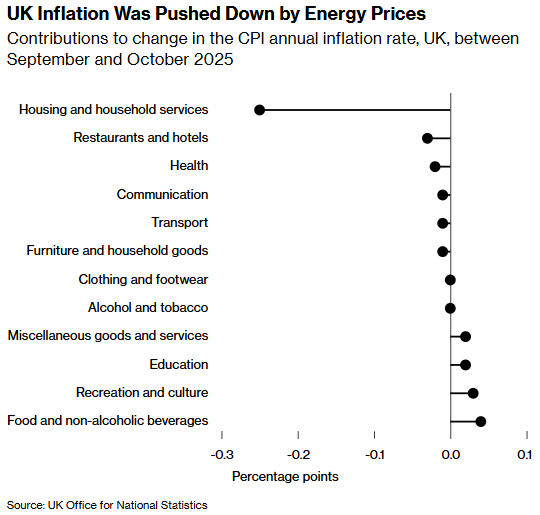 英国国家统计局首席经济学家格兰特·菲茨纳表示,10月通胀放缓"主要受天然气和电力价格驱动",酒店价格也对数据产生下行压力。