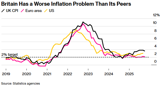 今年夏季,受监管价格、税收上涨以及能源和食品账单等因素推动,英国通胀一度逼近央行2%目标的两倍,引发政策制定者对持续成本压力的担忧。但英国就业市场疲软和增长乏力,增强了市场对再次降息的预期。